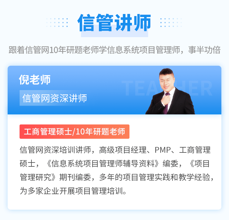信管網(wǎng)為信息化考試與服務(wù)專業(yè)平臺(tái),目前開(kāi)設(shè)有信息系統(tǒng)項(xiàng)目管理師、系統(tǒng)規(guī)劃與管理師、系統(tǒng)集成項(xiàng)目管理工程師、信息安全工程師考試與學(xué)習(xí)服務(wù)。提供了包括考試報(bào)名、考試課程、成績(jī)查詢、真題發(fā)布、資料下載、案例分析、論文、考試教程、在線題庫(kù)、每日一練、章節(jié)練習(xí)、信管人才、論壇交流等服務(wù)。我們將為廣大信管考友提供專業(yè)、及時(shí)、全面、貼心的考試服務(wù),立足于為廣大信管考友建造一個(gè)優(yōu)質(zhì)的學(xué)習(xí)平臺(tái),讓考生都能夠享受學(xué)習(xí),順利通關(guān)。